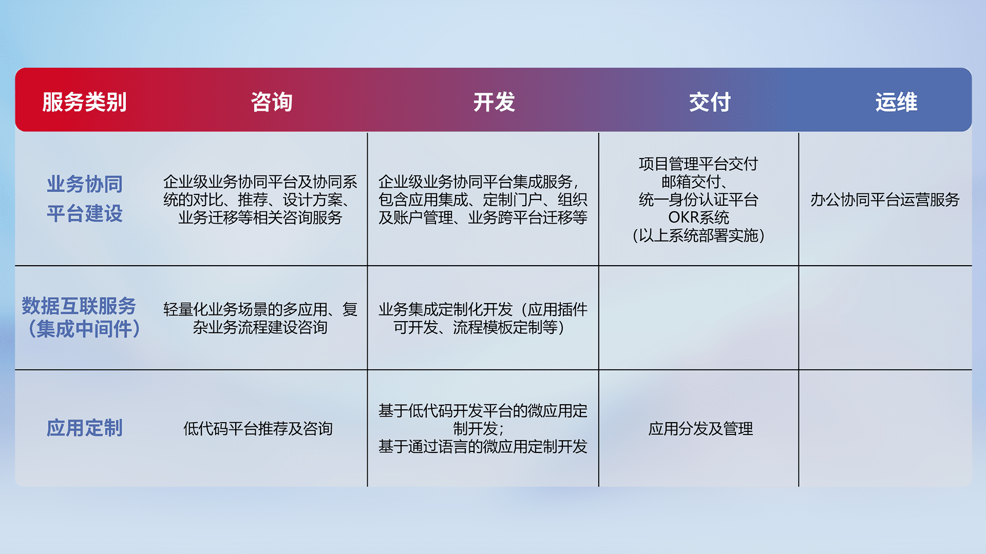 针对钉钉、、企微、、、IDaas等平台级产品提供产品的规划、、、、方案、、、交付、、、定制化开发等服务,,,,实现如统一协同办公、、、智能客户服务、、、、混合会议管理、、智能数据查询、、、等业务场景,,实现数字化转型。。。
