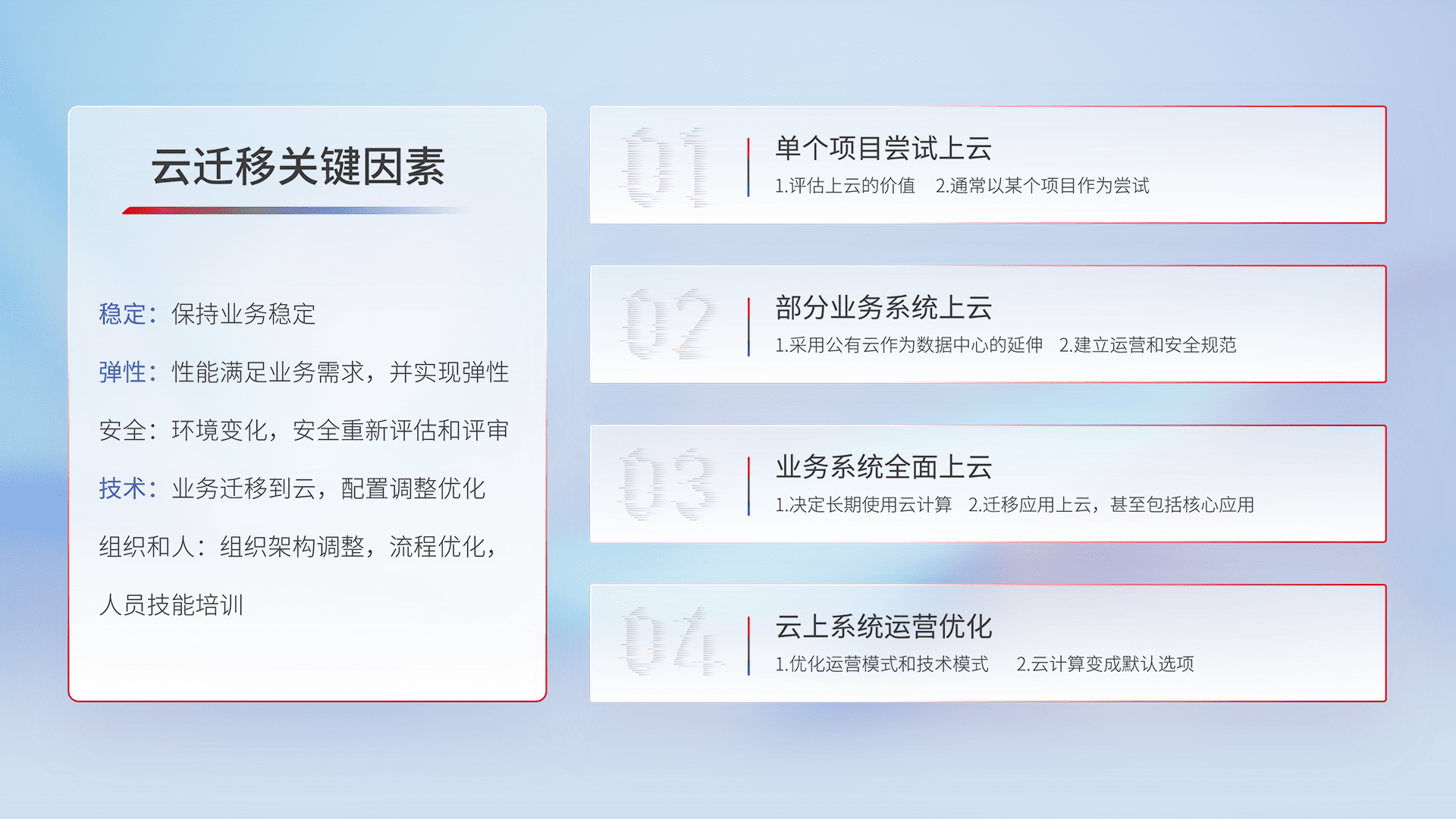 结合实际业务,,,,从规划设计、、云平台选型、、、、云原生改造、、、、数据迁移、、、集成交付,,,,迁移全过程为客户识别最佳上云路径,,做好风险识别管理,,,,设计网络架构、、身份权限、、、、安全审计合规、、、、操作审计、、日志审计、、、监控告警策略、、多站点容灾设计等,,,,对云上基础设施进行整体规划,,,,提升IT治理水平,,,以满足弹性、、高可用、、高性能的需求。。