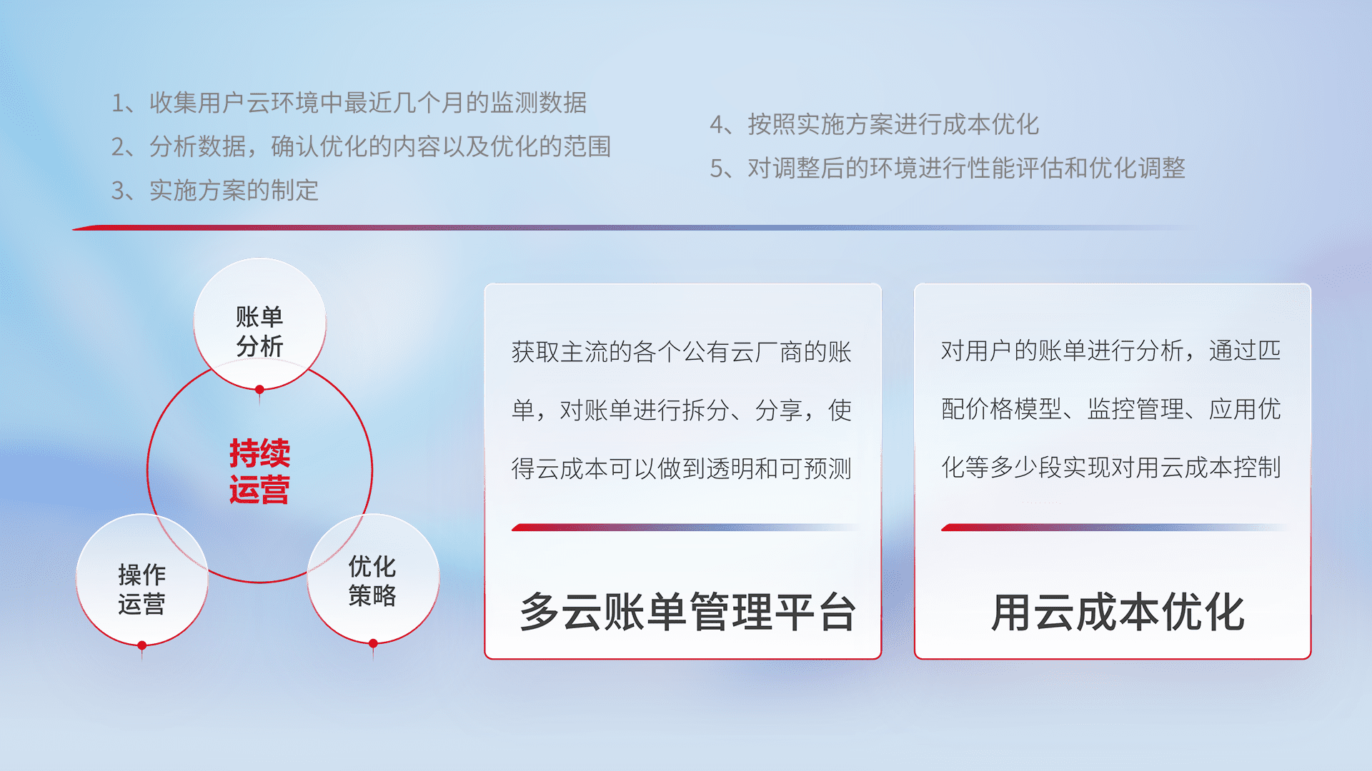 通过多云纳管,,以统一的资源数据模型把客户的云资源进行抽象和封装,,,进而实现对多云资源的统一操作,,,,保障云资源管理的可靠性、、稳定性与可用性。。量身定制化运维内容,,配置、、、、开发运维、、补丁管理、、备份、、监控、、、、认证和访问管理、、审计和日常巡检等,,,保障在用云过程中的可靠度,,,,稳定度以及高可用率。。。